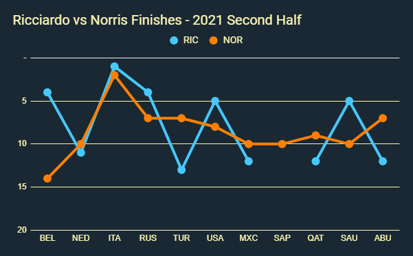 In races where Norris finishes ahead, he beats Ricciardo by an average of 4.55 places, whereas Ricciardo only finishes ahead by an average of 3.33, or 2.50 without Belgium. To give that a bit more meaning, let’s put those numbers in the context of their average finishes. Let’s say Norris finishes ahead and gets his average of 8th place. This means we would expect Ricciardo to finish around 12th or 13th, out of the points by multiple positions. By comparison, if Ricciardo finished in 8th (2 full places higher than his average finish), we could still expect Norris to potentially nab a point, as he would on average finish in 10th or 11th place. To summarize, when Norris finished better (which he usually did), Ricciardo would be significantly behind, while when Ricciardo finished better, Norris could still bring home a decent finish.